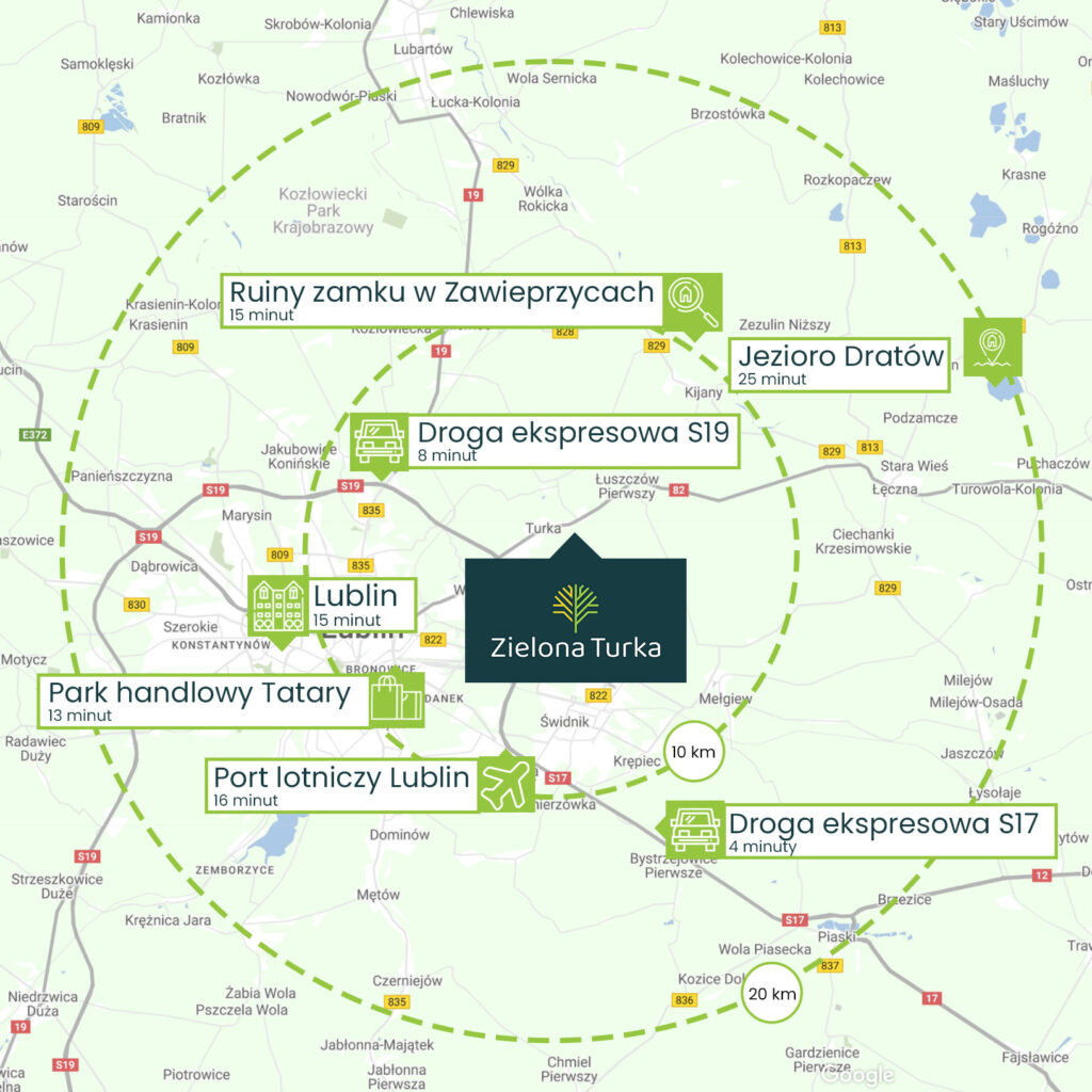 Zielona Turka znajduje się w kameralnej miejscowości blisko Lublina. Wygodny dojazd do stolicy województwa lubelskiego zapewnia m.in. pobliska obwodnica – korzystając z niej możesz dotrzeć do samego serca miasta w ok. 15 minut. Nie musisz jednak polegać wyłącznie na własnym samochodzie, ponieważ niedaleko inwestycji zlokalizowane są również przystanki autobusowe.