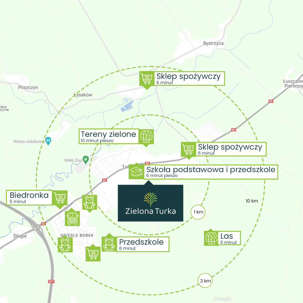Zielona Turka położona jest blisko rozległego lasu ze ścieżkami pieszo-rowerowymi. To idealne miejsce dla osób, które lubią aktywny wypoczynek na łonie natury. Lokalizacja ta jest również bardzo atrakcyjna dla rodzin z dziećmi – blisko do szkoły podstawowej oraz przedszkola, co ułatwia codzienną logistykę. Dodatkowo, w niedalekiej odległości znajduje się wszystko, czego potrzeba do wygodnego życia, m.in.: sklepy, punkty usługowe, apteka, paczkomat i restauracje.